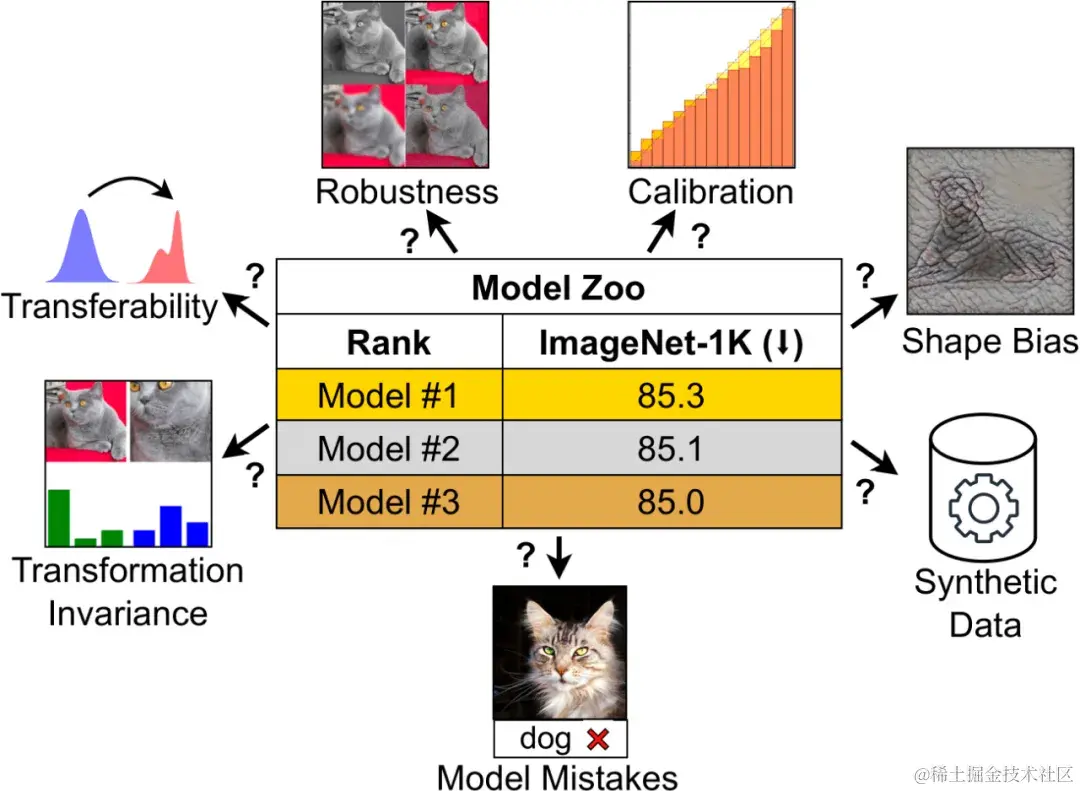 一直以来,ImageNet 准确率是评估模型性能的主要指标,也是它最初点燃了深度学习革命的火种。但对于今天的计算视觉领域来说,这一指标正变得越来越不「够用」。因为计算机视觉模型已变得越来越复杂,从早期的ConvNets到 Vision Transformers,可用模型的种类已大幅增加。同样,训练范式也从 ImageNet 上的监督训练发展到自监督学习和像 CLIP 这样的图像 - 文本对训练。ImageNet 并不能捕捉到不同架构、训练范式和数据所产生的细微差别。如果仅根据 ImageNet 准确率来判断,具有不同属性的模型可能看起来很相似。当模型开始过度拟合 ImageNet 的特异性并使准确率达到饱和时,这种局限性就会变得更加明显。CLIP 就是个值得一提的例子:尽管 CLIP 的 ImageNet 准确率与 ResNet 相似,但其视觉编码器的稳健性和可迁移性要好得多。这引发了对 CLIP 独特优势的探索和研究,如果当时仅从 ImageNet 指标来看,这些优势并不明显。这表明,分析其他属性有助于发现有用的模型。此外,传统的基准并不能完全反映模型处理真实世界视觉挑战的能力,例如不同的相机姿势、光照条件或遮挡物。例如,在 ImageNet 等数据集上训练的模型往往很难将其性能应用到现实世界的应用中,因为现实世界的条件和场景更加多样化。这些问题,为领域内的从业者带来了新的困惑:如何衡量一个视觉模型?又如何选择适合自己需求的视觉模型?在最近的一篇论文中,MBZUAI 和 Meta 的研究者对这一问题开展了深入讨论。