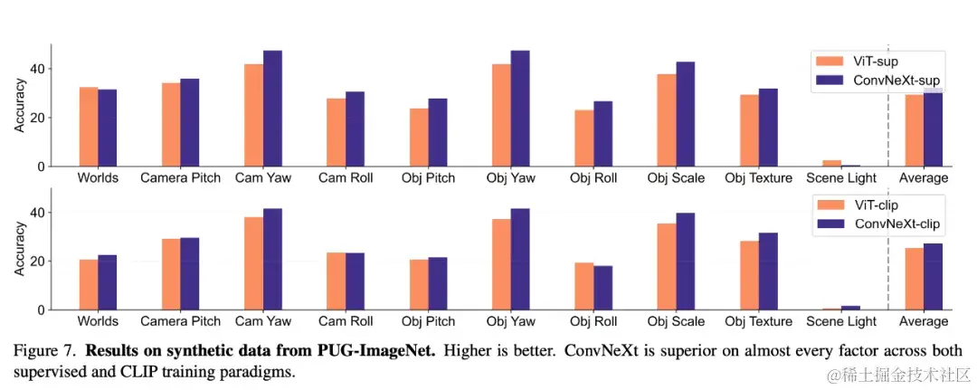 合成数据PUG-ImageNet 等合成数据集可以精确控制摄像机角度和纹理等因素,是一种很有前景的研究路径,因此研究者分析了模型在合成数据上的性能。PUG-ImageNet 包含逼真的 ImageNet 图像,姿态和光照等因素存在系统性变化,性能以绝对 top-1 准确率为衡量标准。研究者提供了 PUG-ImageNet 中不同因素的结果,发现 ConvNeXt 在几乎所有因素上都优于 ViT。这表明 ConvNeXt 在合成数据上优于 ViT,而 CLIP 模型的差距较小,因为 CLIP 模型的准确率低于监督模型,这可能与原始 ImageNet 的准确率较低有关。