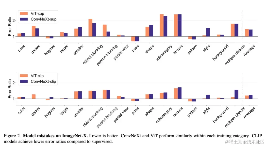 接下来,我们看下研究者如何对不同的属性进行了分析。分析模型错误ImageNet-X 是一个对 ImageNet-1K 进行扩展的数据集,其中包含对 16 个变化因素的详细人工注释,可对图像分类中的模型错误进行深入分析。它采用错误比例度量(越低越好)来量化模型在特定因素上相对于整体准确性的表现,从而对模型错误进行细致入微的分析。ImageNet-X 的结果表明: