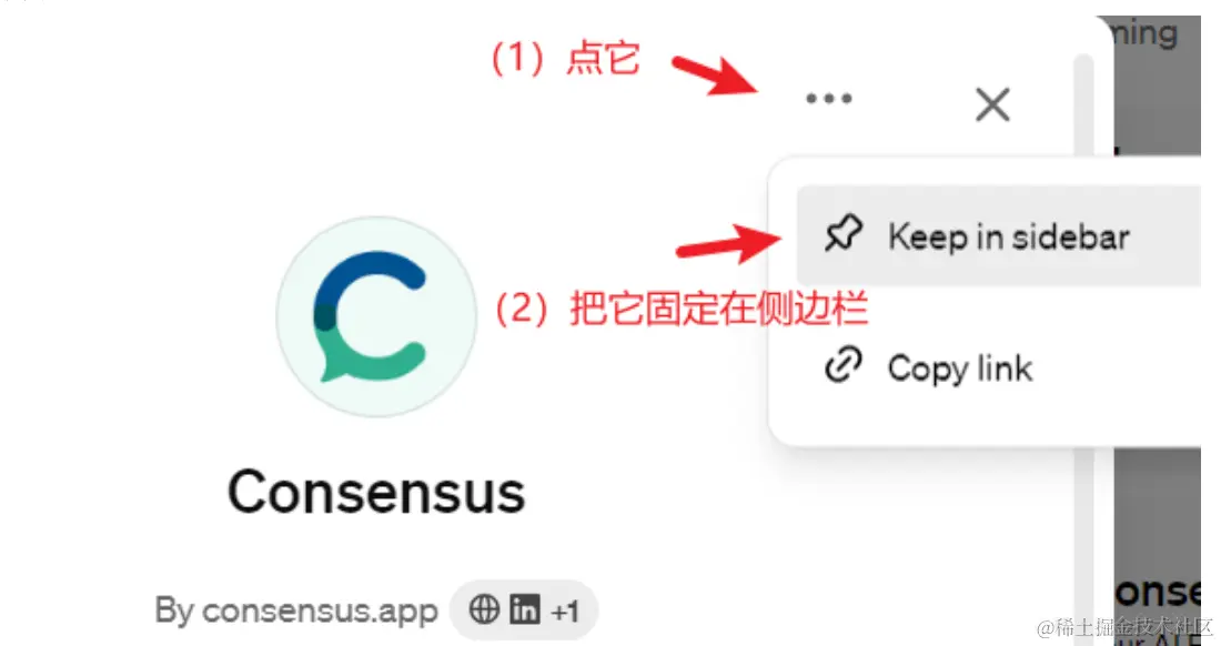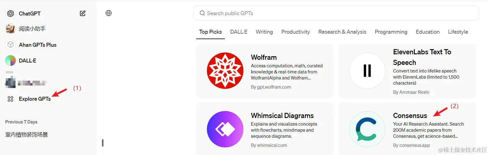 点击左侧的探索GPTs,找到右侧的Consensus这个gpts。如下图所示。
