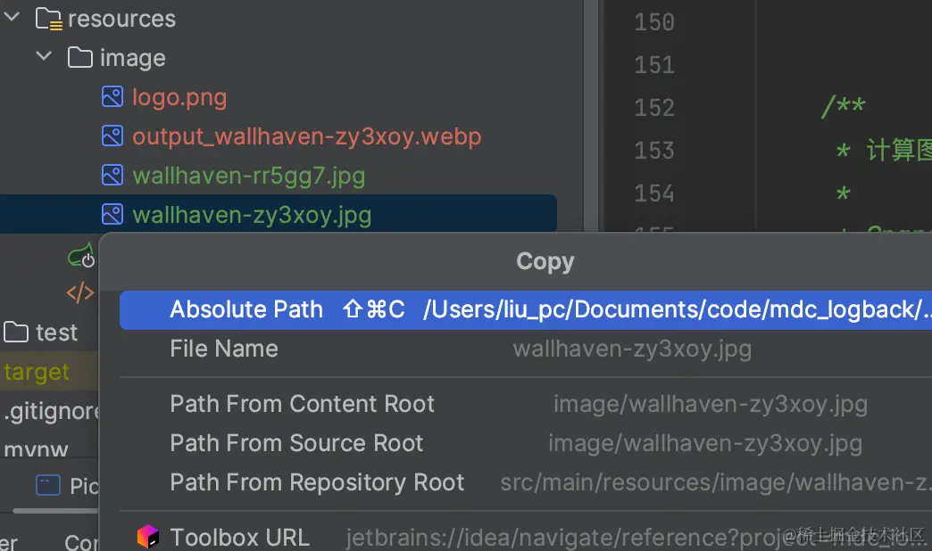 举个例子,我将图片放在resource目录下的image中,可以使用IDEA的Copy Path/Reference功能获取。