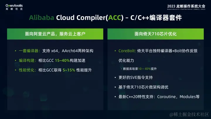 面向 C、C++ 场景有我们有一套自研的编译器套件 Alibaba loud Compiler,简称ACC。ACC 是基于 LLVM 自主研发。我们从两个维度对 ACC 总结。第一个维度,ACC 面向整个阿里云产品,服务云上的客户,一套编译器可以支撑 Intel X64 和 Arm 两种架构。ACC 编译构建速度和传统的 GCC 比大概有 15% 到 40% 的提速。性能优化方面,相比 GCC 大概有 5-15% 的性能提速。第二个维度是面向倚天710的芯片优化,基于倚天平台上独特的 CoreSight 能力,我们构建了 CoreBolt 技术。CoreBolt 可以追踪应用的指令跳转,通过跳转跟踪信息做后期的代码的 layout 优化。CoreBolt 技术在数据库场景已经有大规模应用,大概有 10%~40% 的性能提升。另外一个是面向倚天的 SVE 指令的支持,C++ 很古老,但现在发展也非常快。C++ 20 有非常好的特性,像 Coroutine、Modules,ACC 编译器对这些现代化的 C++ 特性有比较好的支持。