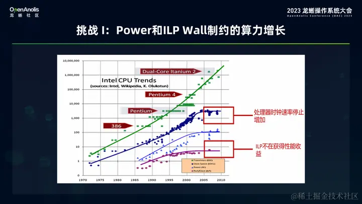第一个挑战是 Power 和 ILP Wall 制约的算力增长。2005 年,C++ 的著名专家 Herb Sutter 在 Dr. Dobb's Journal(DDJ)发表了著名的文章《The Free Lunch Is Over:A Fundamental Turn Toward Concurrency in Software》。