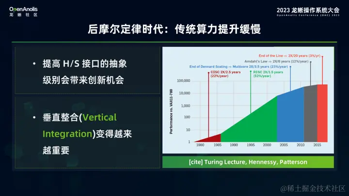 整个算力的提升逐渐放缓,这就是我们说的后摩尔时代,这里有两个观点分享给大家,第一个是关于硬件和软件的接口抽象。提升硬件和软件的抽象层次,可能带来更大的创新机会。举个例子,很早以前程序员写汇编,后面写 C/C++,再到后面写 Java,编程语言抽象级别的提高带来了很大的创新机会。现代化的 Java 高级语言的出现更好地匹配了 2000 年后整个互联网蓬勃发展的速度。第二个是在后摩尔时代怎么提升计算机性能?这也是论文提的一个非常重要的观点,垂直整合,一定要做 Vertical Integration。如果没有垂直整合只能任由算力,或者计算机摩尔定律逐渐失效,这也是我们今天探讨的主题。