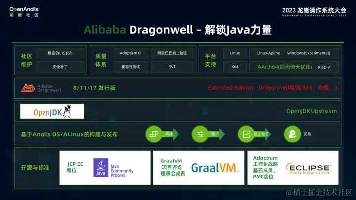 对 C、C++ 的 Workload,Alibaba Could Linux 中通过叠加我们自研的 ACC 编译器, 完成对 C、C++ 全栈的协同优化。很多数据库的 Workload 都是用 C++ 写的。我们再来谈谈 Java。我们通过 Alibaba Could Linux + Alibaba Dragonwell 来做面向 Java 场景的全栈协同优化。Alibaba Dragonwell 是我们自研的 JDK,帮助优化整个阿里云的Java应用。Alibaba Dragonwell 可以基于 Anolis OS 和Alibaba Could Linux构建和发布。目前发布了 8、11、17 三个 Long Term Support(LTS)版本。Dragonwell 分两个版本,一个是标准版,功能基本上和OpenJDK 一样。另一个版本是扩展版,带来很多面向云场景增强,比如 Wisp(协程),RAS 增强都在扩展版中。上面是不同的平台支持、质量体系、社区维护。我们也在积极参与 Java 领域开源和标准工作,阿里云是 Java 标准委员会 JCP-EC 成员(中国唯一),也是 GraalVM 项目咨询理事会成员(中国唯一)。作为 Eclipse Adoptium 工作组战略基石成员,我们也参与 Eclipse Adoptium 社区治理,讨论和建立 JDK 发行版兼容,稳定性标准,拥有 PMC 席位(中国唯一)。