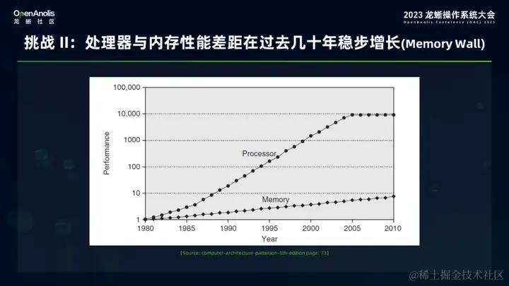 第二个挑战关于内存墙(Memory Wall)。1994 年,弗吉尼亚大学的教授 William Wulf 和他的研究生 Sally McKee 提出:Memory Wall 将成为未来几十年计算机科学领域非常确定性的挑战。Memory Wall 提出的处理器与内存性能的这种差距,在过去几十年中稳步增长。计算机程序有两个部分组成,数据和指令。内存延迟和内存带宽的限制无法很好的让程序的指令和数据更好地接近 CPU,让 CPU 忙起来(CPU 永远在等内存取数据)。这是内存墙带来的挑战。上面这张图是从《Computer Architecture: A Quantitative Approach》第 5 版中借鉴过来的。时间轴从1980 年到 2010 年,下面是内存,上面是 CPU 的性能。Memory Latency, 以 1980 年 64 KB DRAM 为 Baseline,每年大约 7% 的性能提升。而 Processor 性能在1980-1985,每年大约 22% 的性能提升,1985 年-2000 年,每年大约 52% 性能提升。2000 年-2005 年,每年大约 20% 性能提升。2005 年以后到 2010 年,尽管 per-core basis 的性能并无多大变化,但就像我们前面所述,2005 年后开始转向多核,多核让共享的内存资源的争抢更加加剧。怎么样在软件层面解决内存墙的问题也是非常关键的。
