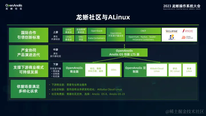 整体上看,龙蜥社区分三层:最上层更多的是龙蜥社区和国际开源社区的合作,包括 Linux Foundation,这是整个龙蜥社区的基础,因为龙蜥本身就是操作系统。除了 Linux Foundation 外,也投入与云原生 CNCF 基金会的合作,以及和 Java 领域的两大顶级基金会 Eclipse 和 Apache 的合作。中游是原生发行版社区,通过产业协同去促进整个产品演进迭代。当我们有了非常好的开源社区,如何支撑下游可持续的商业模式?龙蜥社区根据场景的不同,提供了三个版本类别:第一个是 Anolis OS 商业版,比如统信、麒麟商业版。第二个是企业定制版,而 Alibaba Cloud Linux 就是龙蜥社区定制版。最后一个就是开源社区的免费版本,如 Anolis OS 23、Anolis OS 8 等等。