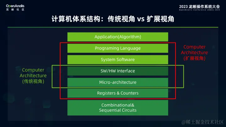 我们怎么看待和解决以上挑战?上图中绿色线是传统的计算机体系结构的定义。为了解决上面的挑战,我们应该从更加的扩展视角看待整个计算机体系结构(红色框表示),包含了从芯片到整个系统软件、编程语言、应用层的扩展视角看整个体系结构。