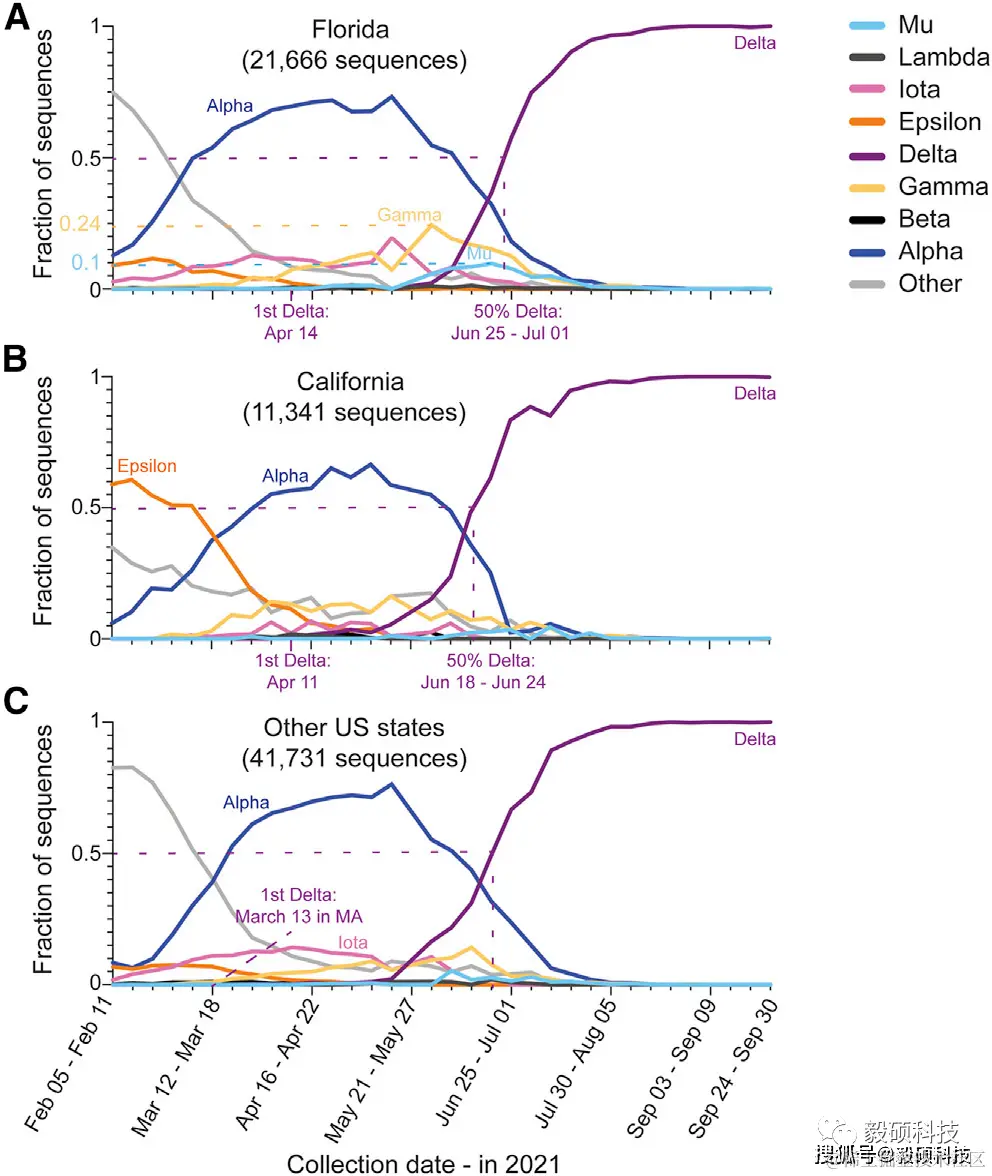 该研究的目标是:(1) 分析德尔塔变体对美国阿尔法流行率的影响;(2) 评估德尔塔变体对美国伽马流行率的影响;(3) 检验德尔塔变体传播性更高是由于鼻腔内病毒载量更高这一假设。