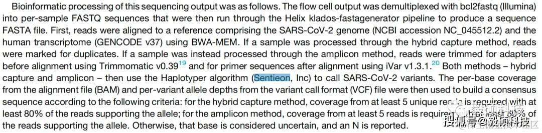 在该研究中,研究者使用Sentieon软件进行SARS-Cov-2 病毒的变异检测。