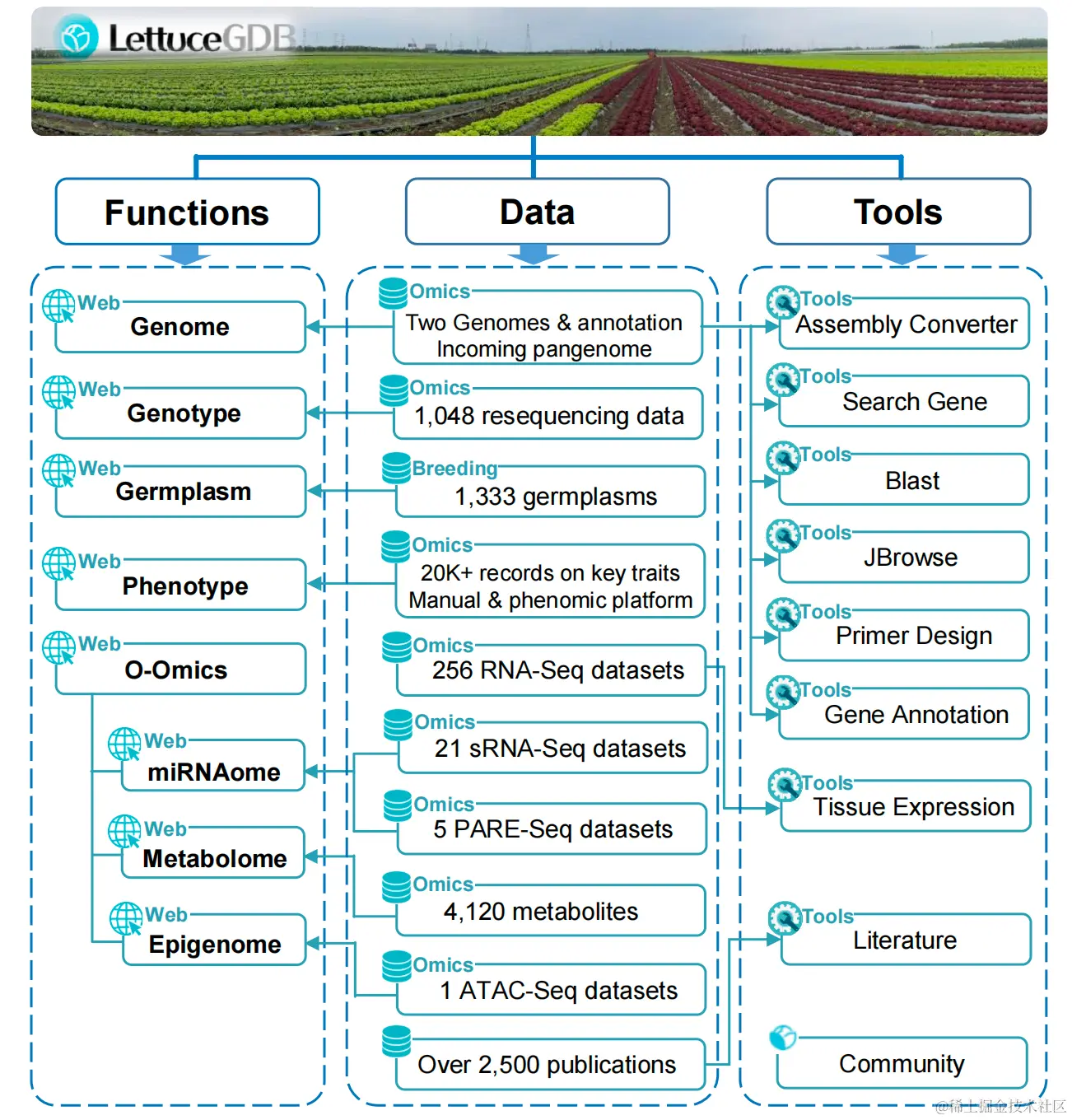 生菜作为全球流行的叶菜类植物和菊科的代表性植物,具有重要的经济和学术意义。近十年来,生菜中的高通量测序、表型分析等多组学数据大规模积累,从而增加了对综合生菜数据库的需求。
