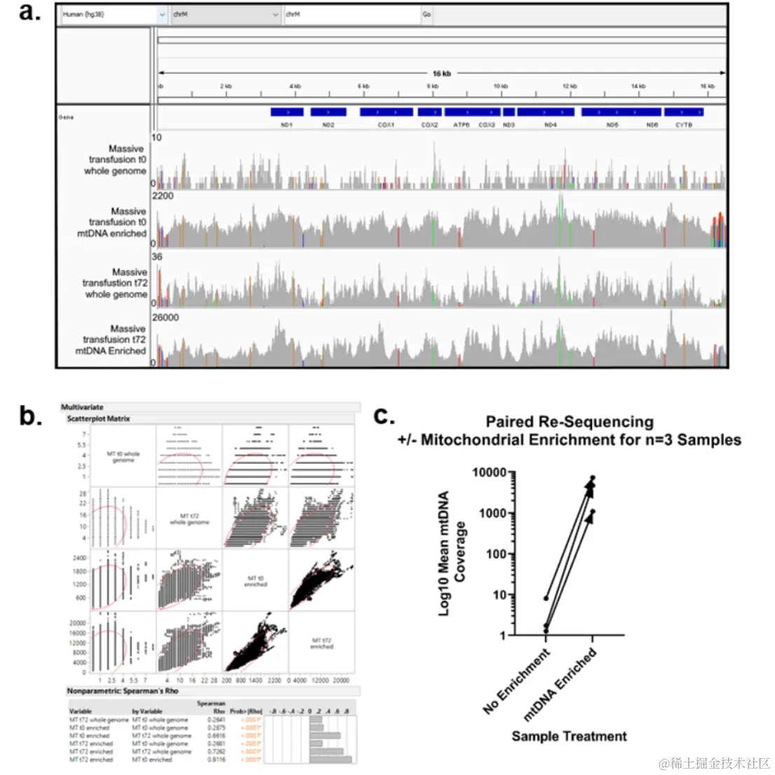 血浆中线粒体 DNA (mtDNA) 片段的存在是一种促炎损伤相关分子模式 (DAMP),与多种人类疾病的结果呈正相关。由于 mtDNA 仅占血浆中总 DNA 的一小部分,因此通常采用 qPCR 作为分析策略。然而,这种方法几乎无法深入了解循环 mtDNA 片段的序列起源或其他特征。在该研究中,研究者发现,对来自严重受伤患者的血浆 mtDNA 进行靶向捕获,可以富集约 1400 倍,从而为NGS提供了足够的深度。该方法使用严格的比对和过滤策略排除核线粒体插入 (NUMT),该策略调用并量化参考基因组中的 NUMT 和多态性 NUMT。富集后,对 mtDNA 基因组的平均覆盖度进行了 2,000–60,000 ×的测序。将 mtDNA 丰度标准化为 NUMT 覆盖率可减少批次变异性。该方法能够检测低频异质变体。