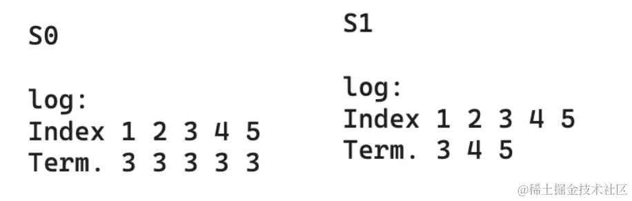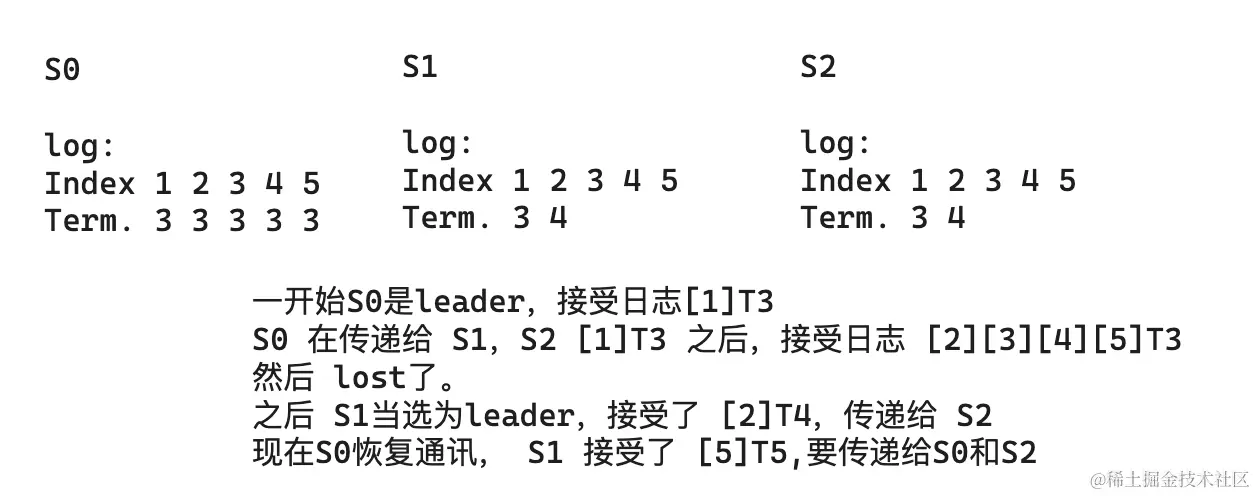 随后,S0 接收到连续的日志条目 [2][3][4][5],任期号均为 3。然后,S0 的通信中断了。