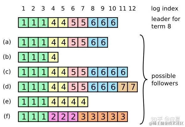 如果日志不一致,完全和leader保持一致。一个Follower可能会丢失掉Leader上的一些条目(b),也有可能包含一些Leader没有的条目(d),也有可能两者都会发生(e)。丢失的或者多出来的条目可能会持续多个任期。