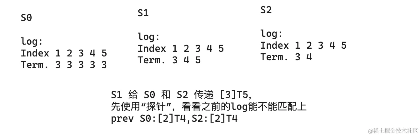 S1 通过“探针”方式向 S0 和 S2 传递了日志条目 [3],任期号为 5。在进行传递之前,S1 使用探针查看之前的日志是否能够匹配上: