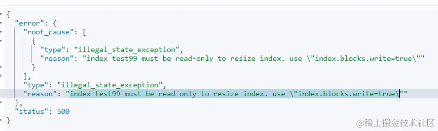 PUT test01/_settings { "settings": { "index.blocks.write": true } }test01需要换成要扩增的索引的名字,不是新索引的名。 -