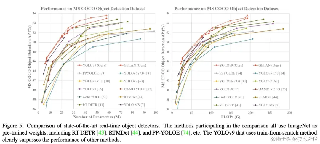 该研究还将 ImageNet 预训练模型纳入比较中,结果如下图 5 所示。值得注意的是,使用传统卷积的 YOLOv9 在参数利用率上甚至比使用深度卷积的 YOLO MS 还要好。