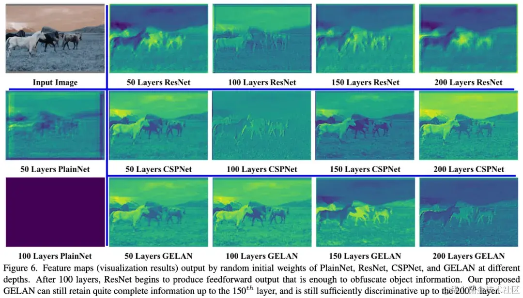 研究者通过对信息瓶颈的深入分析,推断出了该问题的根本原因:梯度最初从非常深层的网络传递出来后不久,就丢失了许多达成目标所需的信息。为了验证这一推断,研究者们对具有初始权重的不同架构的深度网络进行前馈处理。图 2 对此进行了可视化说明。显然,PlainNet 在深层丢失了很多进行对象检测所需的重要信息。至于 ResNet、CSPNet 和 GELAN 能够保留的重要信息比例,确实与训练后能够获得的准确性正相关。研究者进一步设计了基于可逆网络的方法来解决上述问题的原因。
