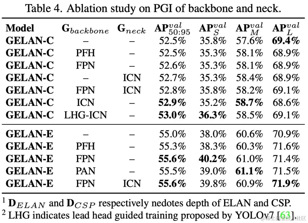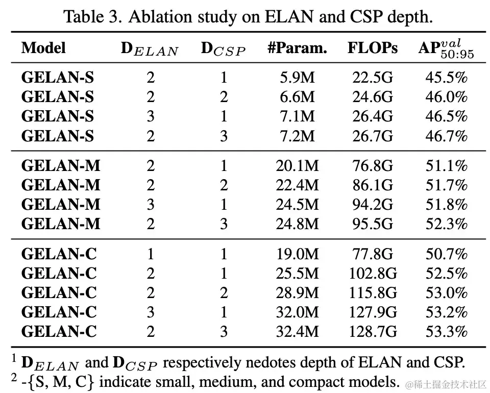 然后该研究又在不同尺寸的 GELAN 上针对 ELAN 块深度和 CSP 块深度进行了消融实验,结果如下表 3 所示。
