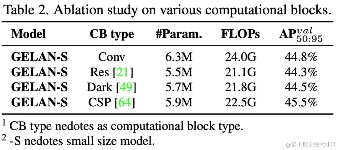 该研究首先对 GELAN 的计算块进行消融实验。如下表 2 所示,该研究发现用不同的计算块替换 ELAN 中的卷积层后,系统可以保持良好的性能。