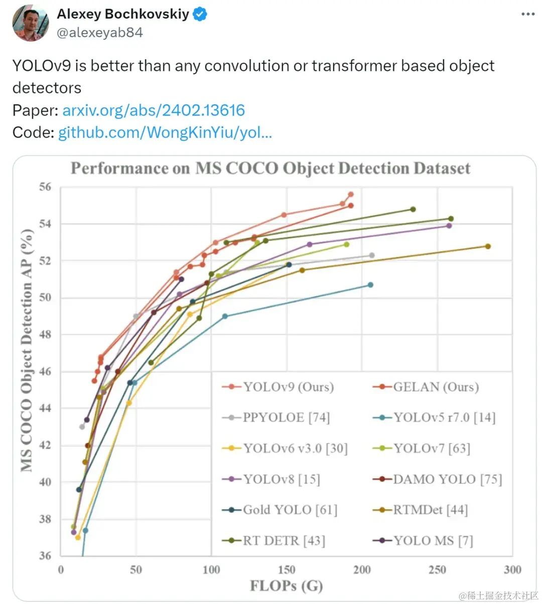 对于新发布的 YOLOv9,曾参与开发了 YOLOv7、YOLOv4、Scaled-YOLOv4 和 DPT 的 Alexey Bochkovskiy 给予了高度评价,表示 YOLOv9 优于任何基于卷积或 transformer 的目标检测器。