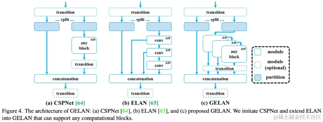 此外,该研究还提出了一个新的网络架构 GELAN(如下图所示),具体而言,研究者把 CSPNet、 ELAN 这两种神经网络架构结合起来,从而设计出兼顾轻量级、推理速度和准确性的通用高效层聚合网络(generalized efficient layer aggregation network ,GELAN)。研究者将最初仅使用卷积层堆叠的 ELAN 的功能泛化到可以使用任何计算块的新架构。