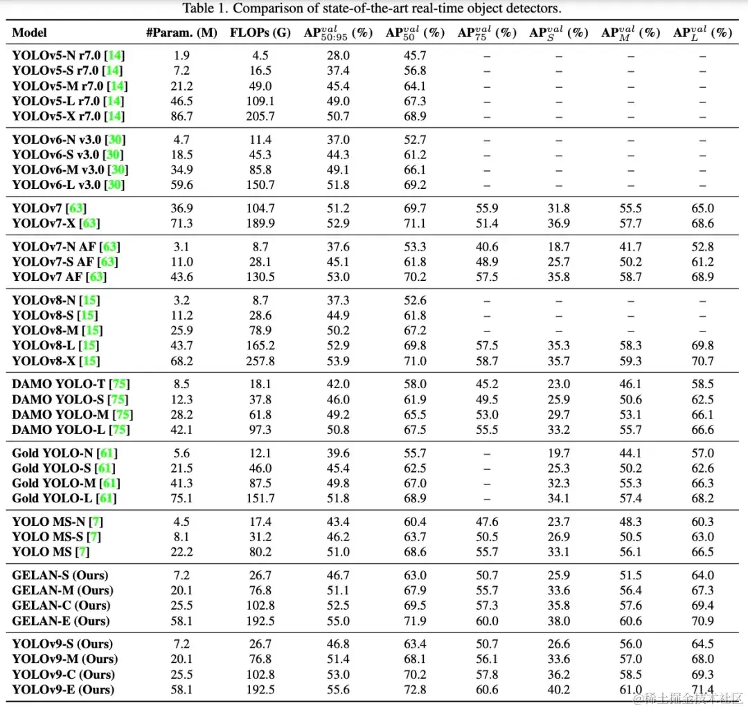 为了评估 YOLOv9 的性能,该研究首先将 YOLOv9 与其他从头开始训练的实时目标检测器进行了全面的比较,结果如下表 1 所示。