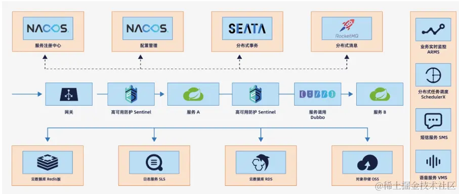 - 微服务通信:在SpringCloud Alibaba中支持RPC与RESTful两种方案,对应的产品为Dubbo与OpenFeign。