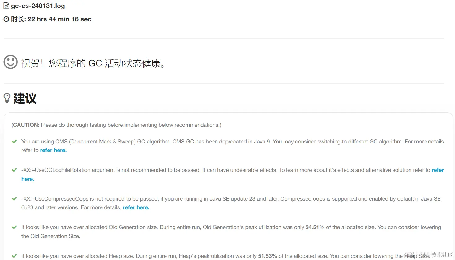 当然,这是一个健康的状态,但是仍然给了你一些优化建议,这就可以算作对GC问题开的药方。如果你去体检结果非常健康,报告上也会告诉你多吃蔬菜少喝酒一样的道理。