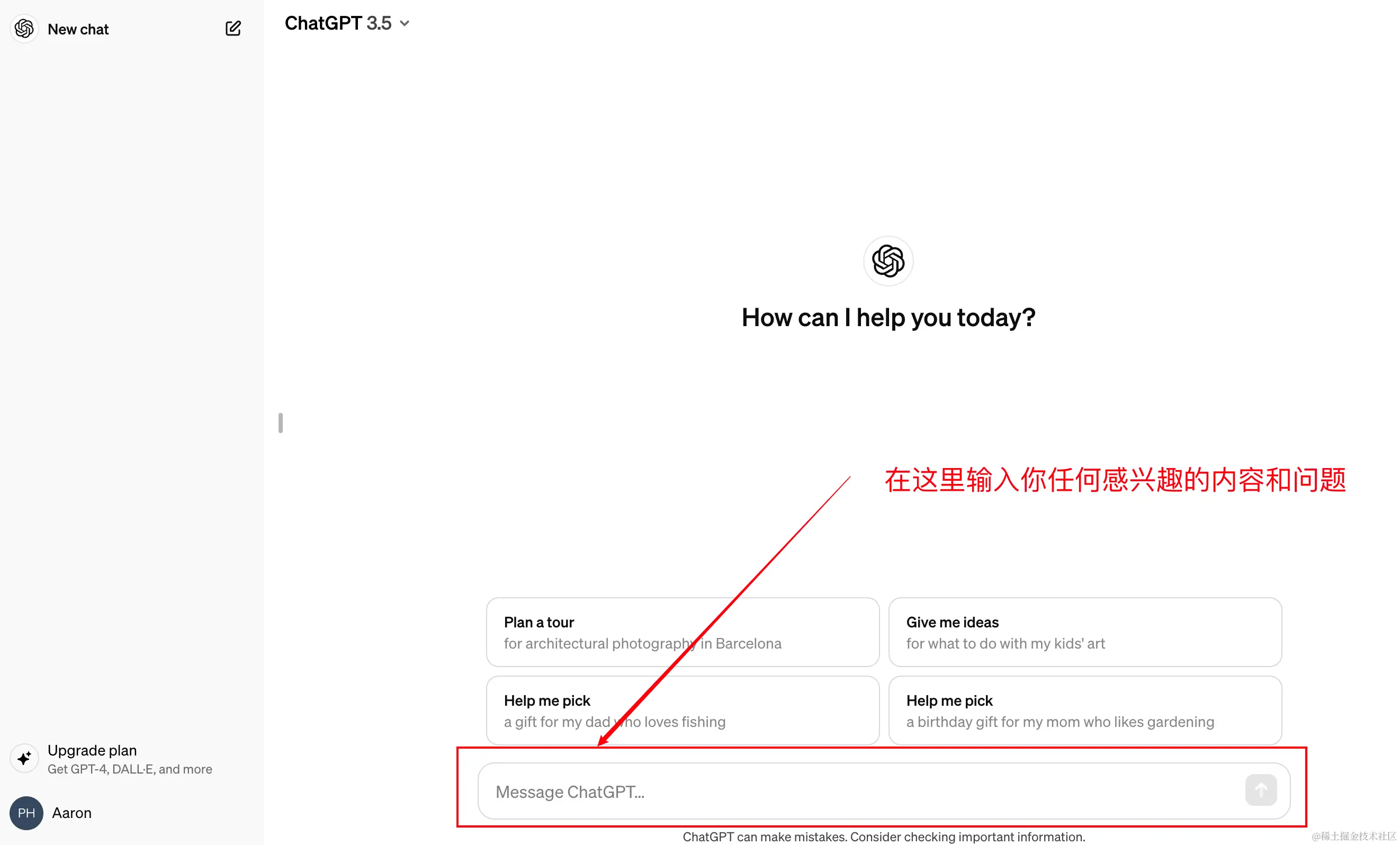 在最下方的输入框中,就是我们和ChatGPT交互的输入对话框。整个界面非常的简单易用。我们可以在输入框中输入任何我们感兴趣的文日和问题,然后输入回车。ChatGPT就会给出回答。