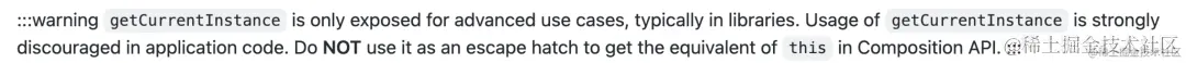 注意:getCurrentInstance 作为访问内部组件实例的方法,官方是不鼓励在应用程序代码中使用的,下面贴上官方原文及例子: