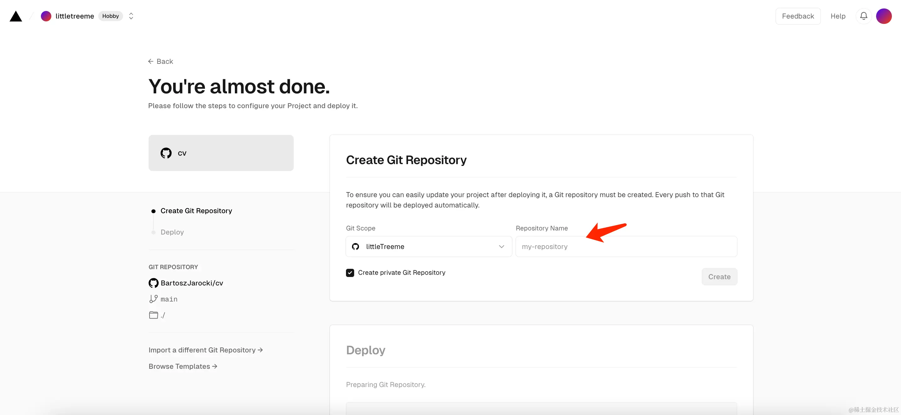 接下来,在跳转的Vercel的官方网站上,有一个输入框,提示我输入项目名称。