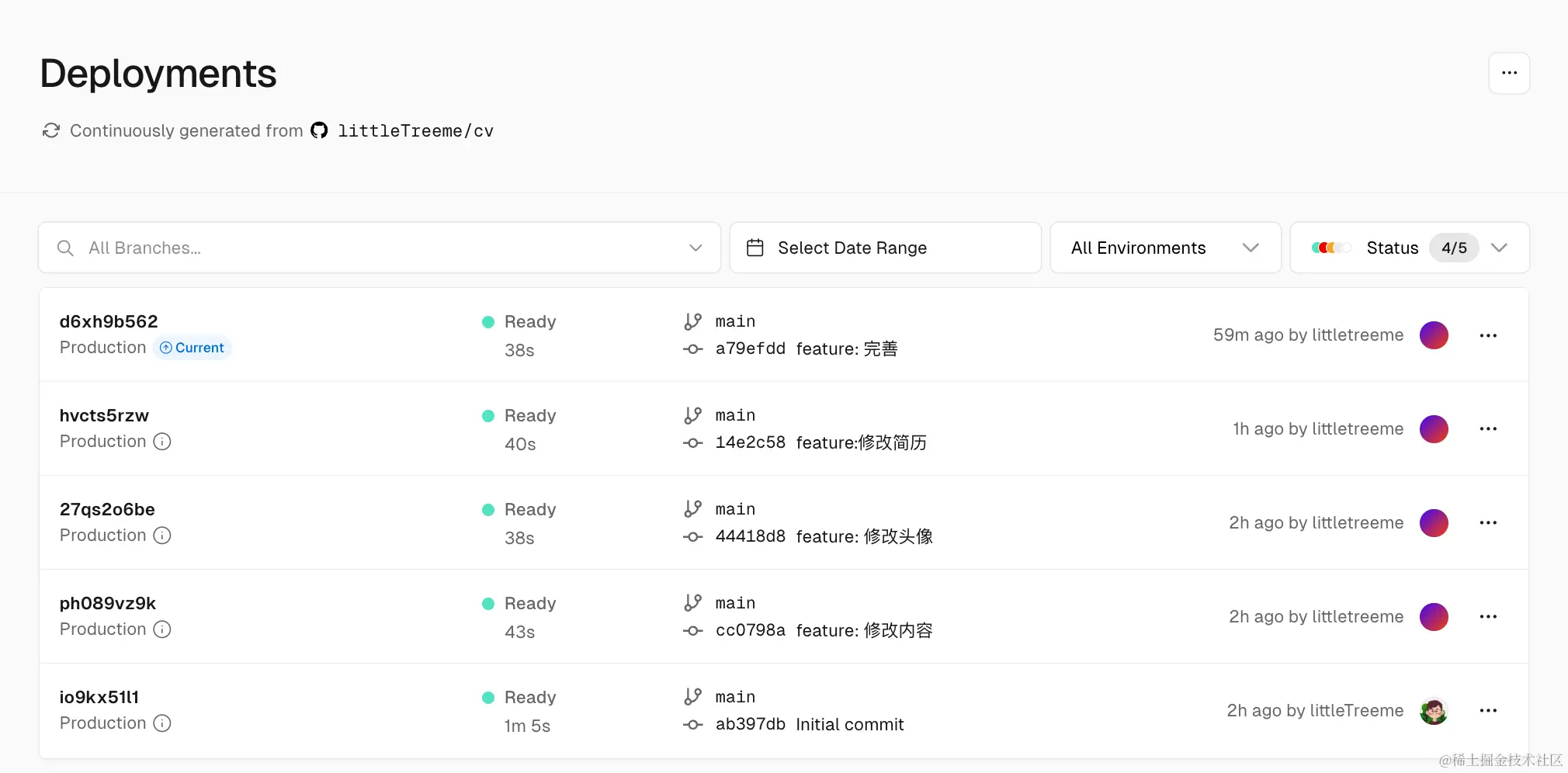 最后提交代码后,Vercel会自动触发了构建过程,同步更新你提交的代码,确保在线简历始终保持最新状态。