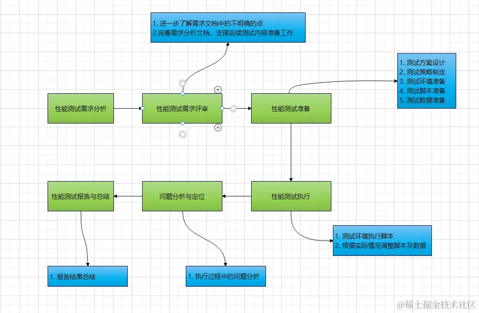 这 6 个阶段是毕竟的阶段,缺一不可,不同的企业发起性能测试时,通常流程只会比这 6 个阶段多,不会减少流程或直接开始做。
