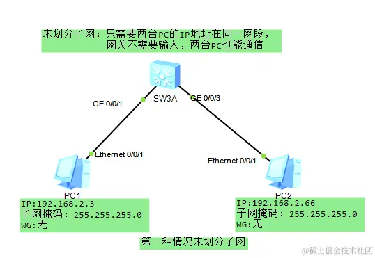 划分了子网,子网掩码变了,必须设置网关,且网关地址跟划分了几个子网有关系,设置完网关,配置交换机的vlanif地址,两台pc就能通信