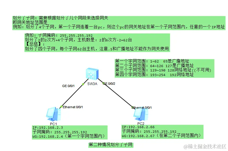 例如:划分了4个子网,第一个子网连着一台pc,则这个pc的网关地址在第一个子网范围内,任意的一个IP地址;若超出这个范围,则两台pc不能通信