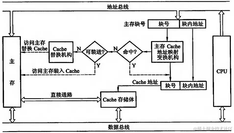 CPU(通过地址总线)给出地址,这个地址包括**(主存)块号和块内地址**。块内地址直接传给Cache,使用块号在主存Cache地址映像机构中确认是否命中。如果发生命中,得到Cache的块号;如果未命中,查看Cache中是否有空间可装入主存块。若有,访问主存装入Cache;若没有,启用Cache替换机构,根据替换算法,决定Cache中哪块可以被替换,然后访问主存替换Cache即可