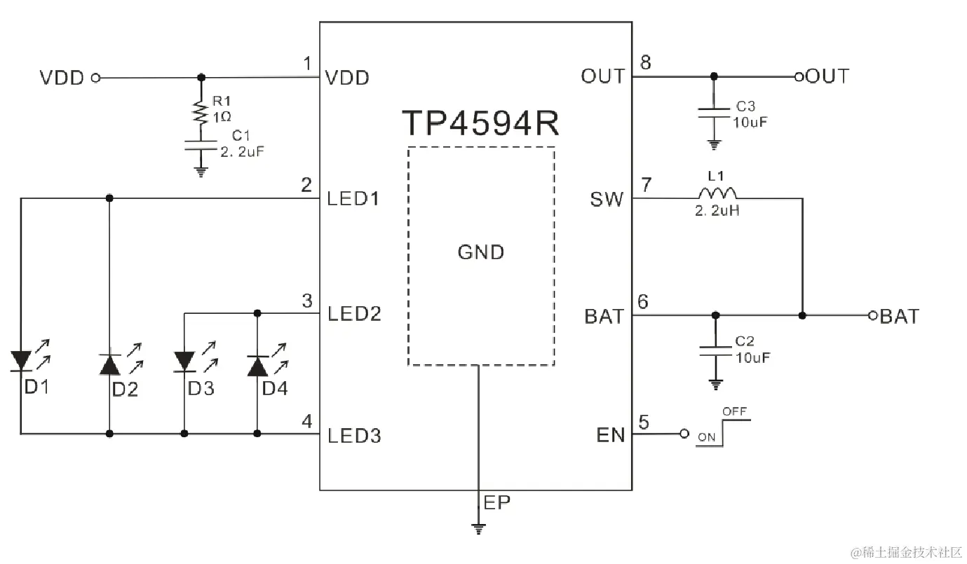 启动时,当 BAT 电压大于 3.15V 时,升压电路开始工作,工作过程中如果电池电压低于 3.05V,则 LED1 会以 2HZ频率快闪提醒电量较低,当电池电压低于 2.85V,则放电输出关闭,TP4594R 进入低电流待机模式。