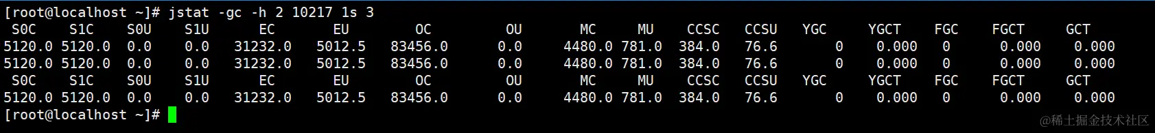 [root@localhost ~]# jstat -gc -h 2 10217 1s 3
