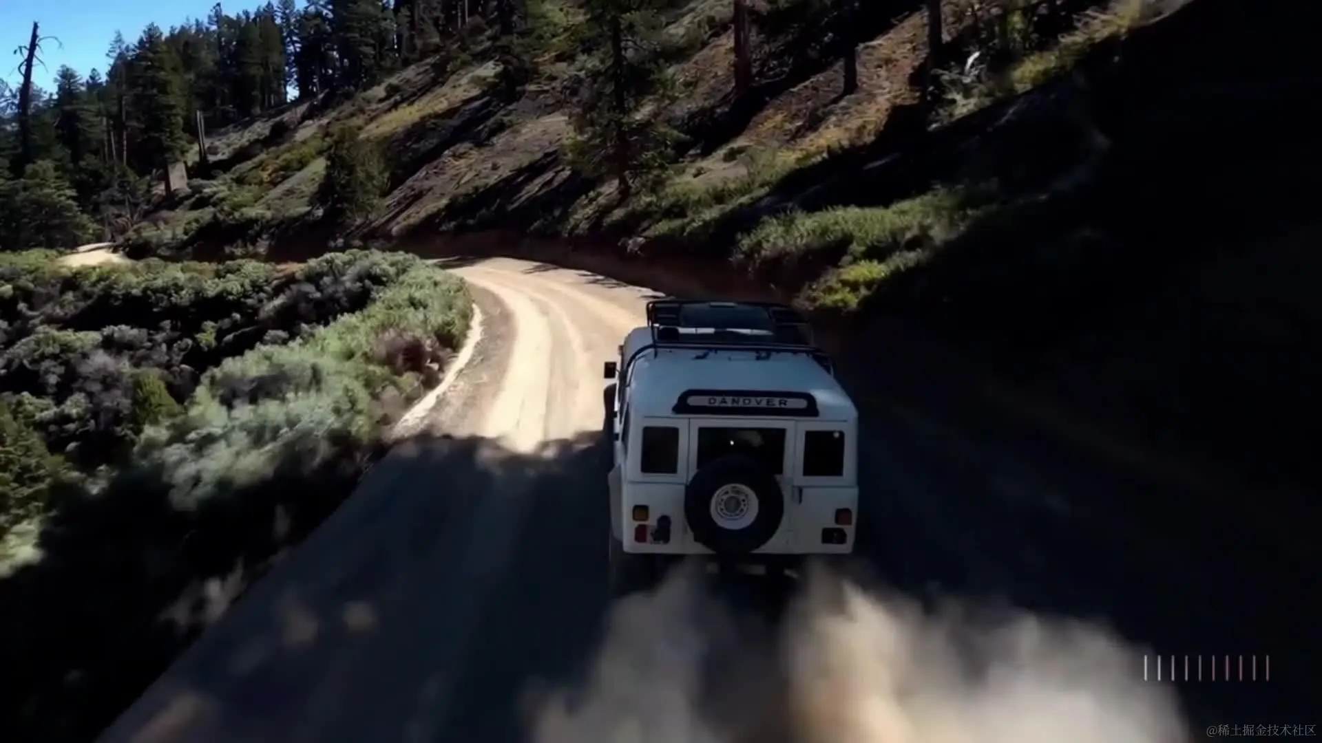 翻译:摄像机跟随一辆白色老式SUV,顶部有黑色行李架,它加速通过一条陡峭的土路,周围是松树,地势陡峭,车轮卷起了尘土,阳光照射在SUV上,它沿着土路飞驰,给场景增添了温暖的光芒。土路在远处轻轻弯曲,看不到其他车辆。路边的树是红杉,绿色的植物点缀其中。汽车从后方的镜头中轻松地跟随着曲线,使其看起来好像在崎岖的地形中轻松驾驶。土路周围是陡峭的山丘和山脉,天空晴朗,偶有薄云飘过。