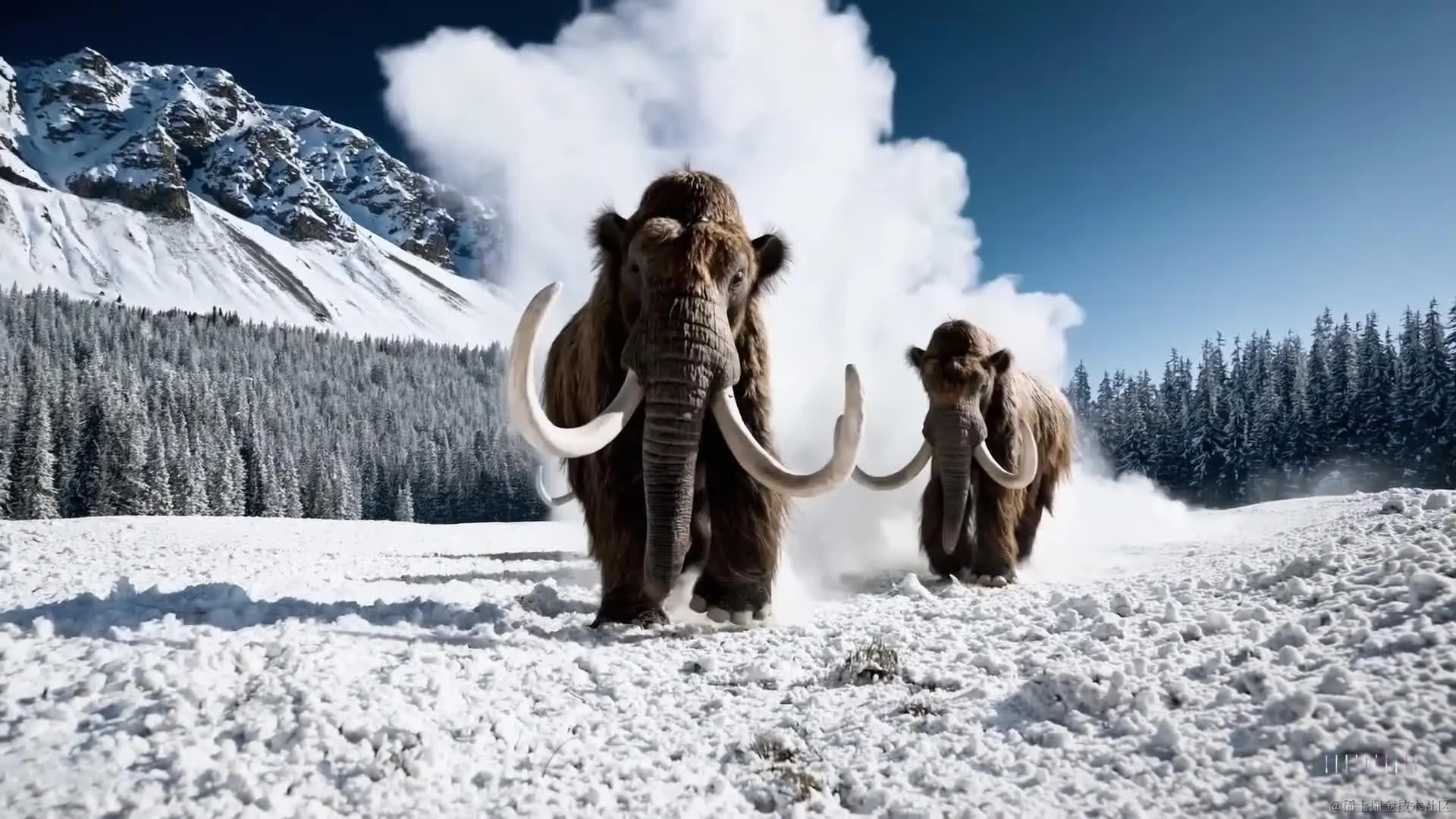翻译:几只巨大的长毛猛犸象踏过一片雪白的草地,它们长长的毛发在微风中轻轻飘动着,远处覆盖着雪的树木和雄伟的雪山,午后的光线下有些薄云,太阳高悬在远方,营造出温暖的光芒。低角度的摄影视角令人惊叹,捕捉到了这些大型毛茸茸的哺乳动物,画面景深感强烈。