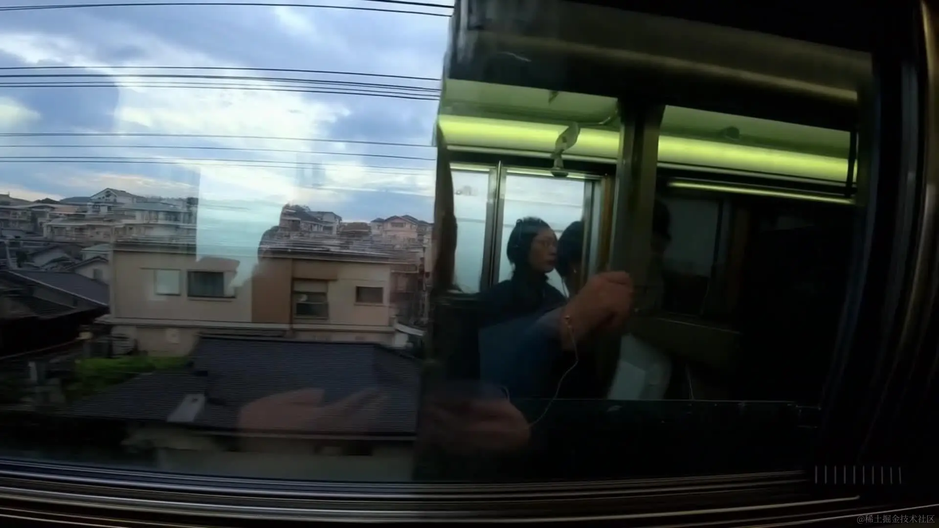 翻译:一辆列车穿越东京郊区时,窗户上的倒影。