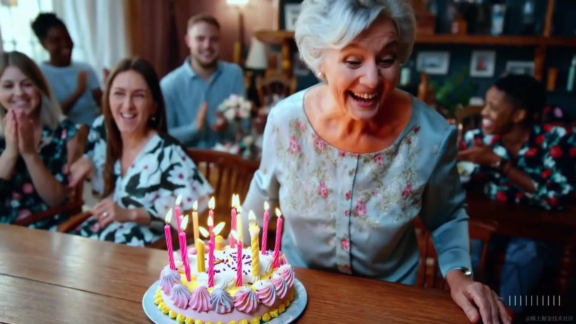 翻译:一位头发整齐梳理的祖母站在木制餐桌后面,桌上摆放着一个五彩缤纷的生日蛋糕,上面点着许多蜡烛,她的表情洋溢着纯粹的喜悦和幸福,眼中闪烁着快乐的光芒。她向前倾身,轻轻吹灭了蜡烛,蛋糕上涂着粉红色的糖霜和彩色糖粒,蜡烛的火焰也熄灭了,祖母穿着一件淡蓝色的上衣,上面点缀着花卉图案,可以看到几位快乐的朋友和家人坐在餐桌旁庆祝,但是他们处于焦点之外。这个场景被美丽地拍摄下来,有电影般的感觉,展示了祖母和餐厅的三分之四视角。温暖的色调和柔和的光线增强了氛围。