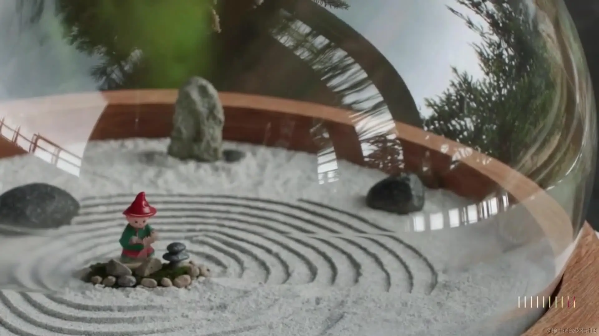 翻译:放大观看一个玻璃球,里面有一个禅宗花园。球内有一个小矮人,他正在用耙子整理禅宗花园,并在沙地上创造出图案。