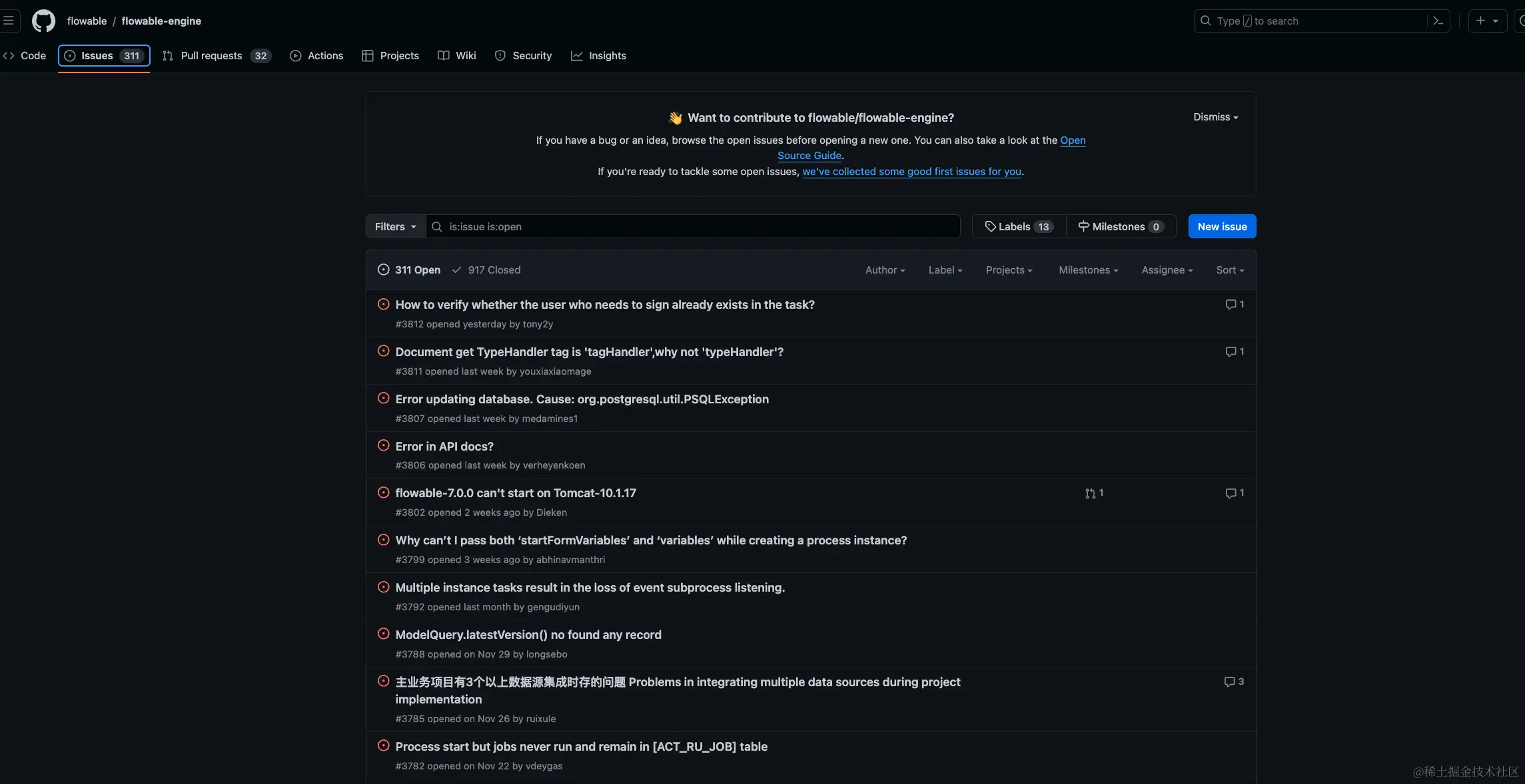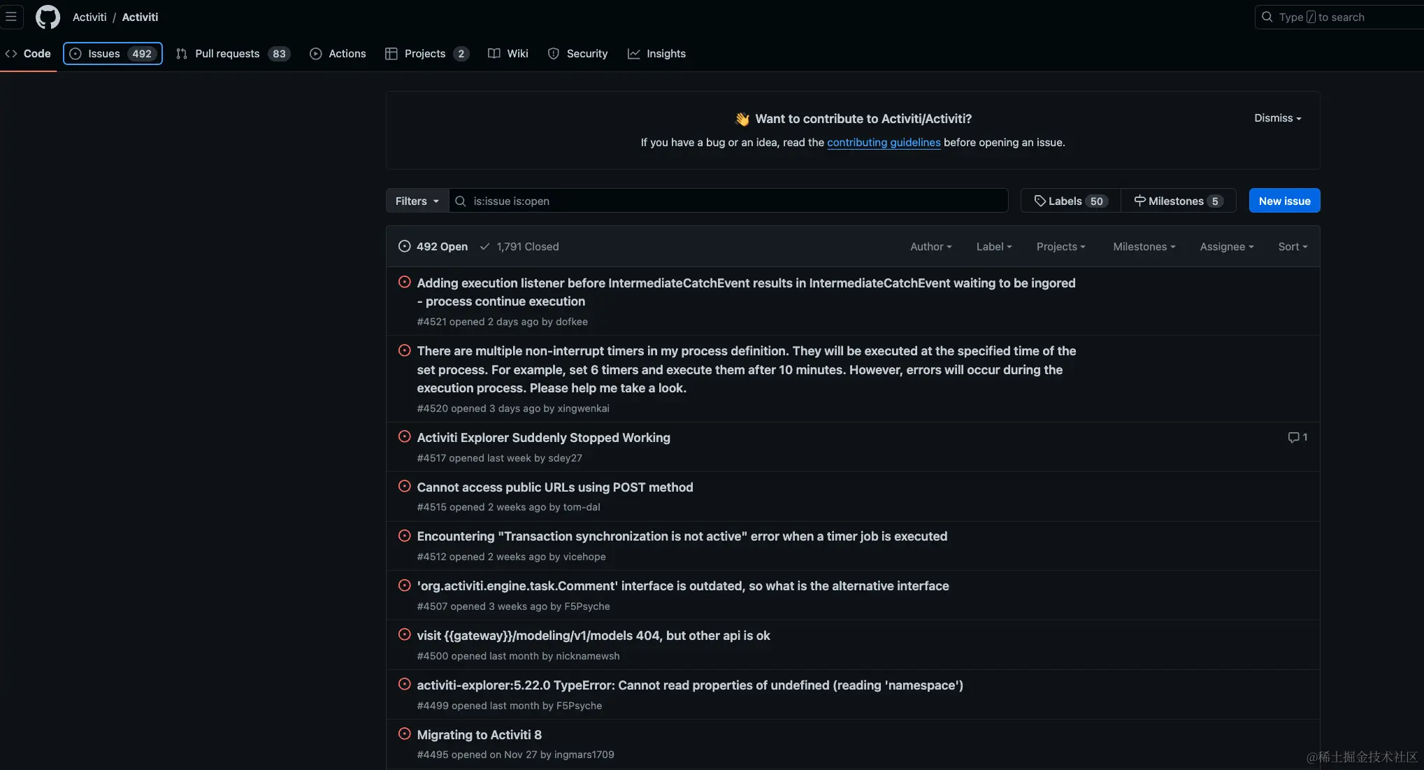 - github活跃度来看, activiti和flowable比较相似,camunda不算太活跃(可能是过去国人关注的少,中文文档也欠缺)。