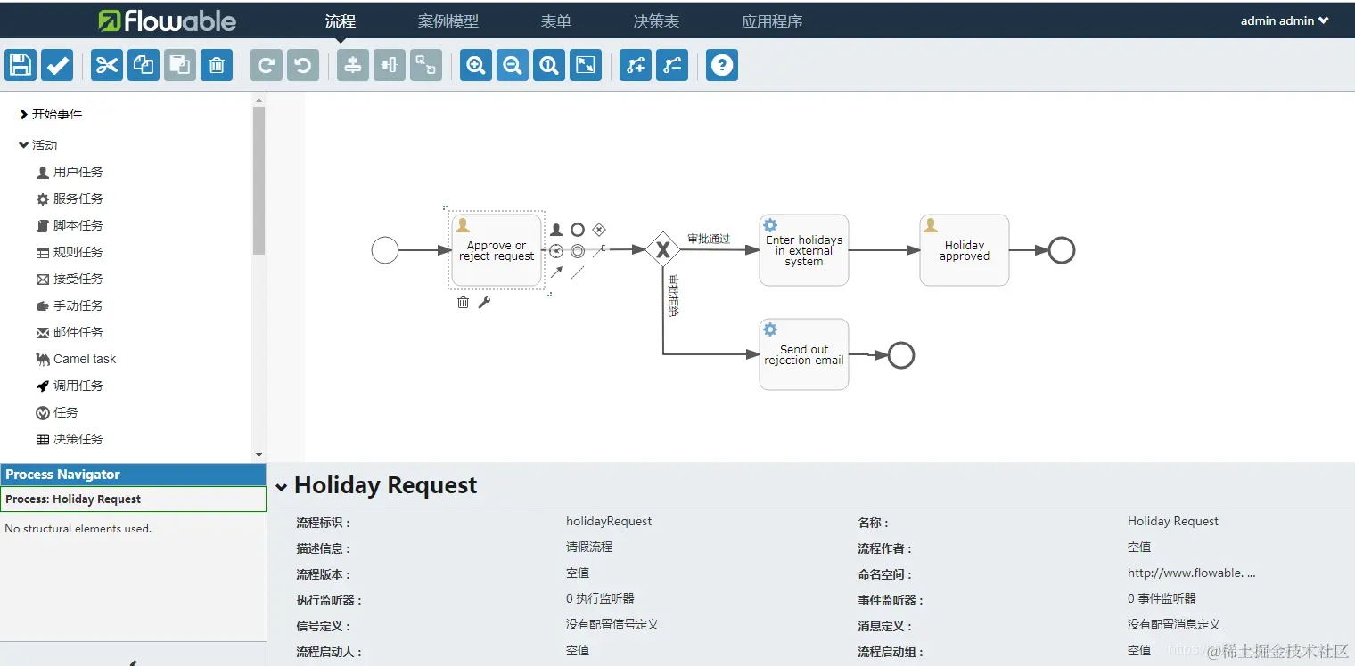flowable开源版本中带了web版流程设计器,展示风格和功能基本跟Activiti-Modeler一样,优点是集成简单,开发工作量小,缺点是界面不美观,用户体验差。