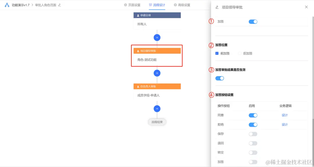 ③:加签审批结果是否生效,开启后加签人审批同意与否和正常审批流程一样,影响流程走向。