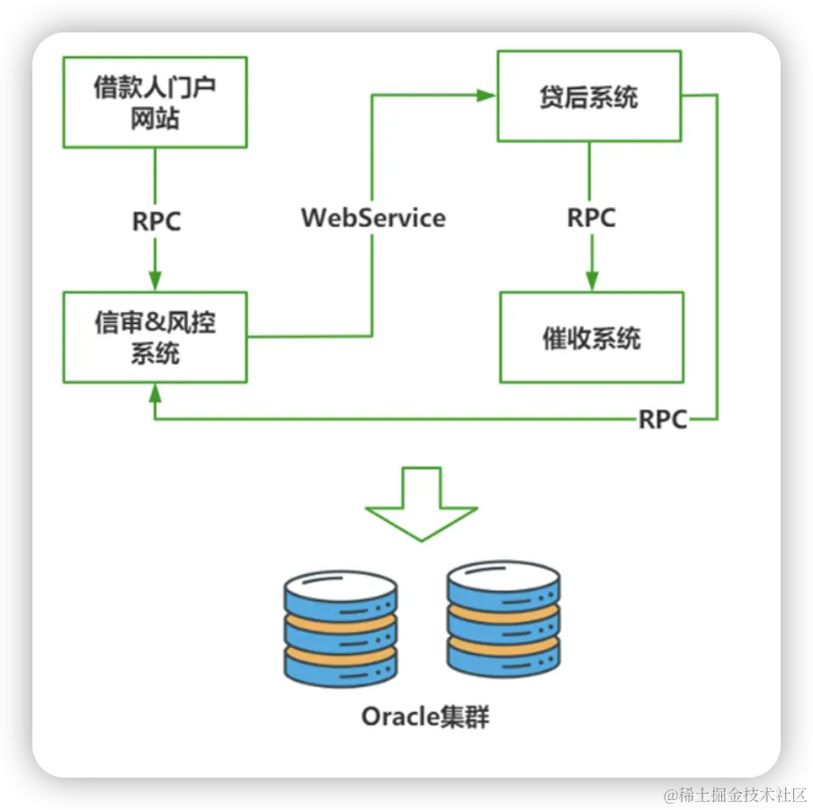 比如入上的金融企业的贷款服务。按照贷款的业务职能,将平台分解为4个部分,分别是产品超市(门户网站)、风控系统、贷后系统和催收系统。