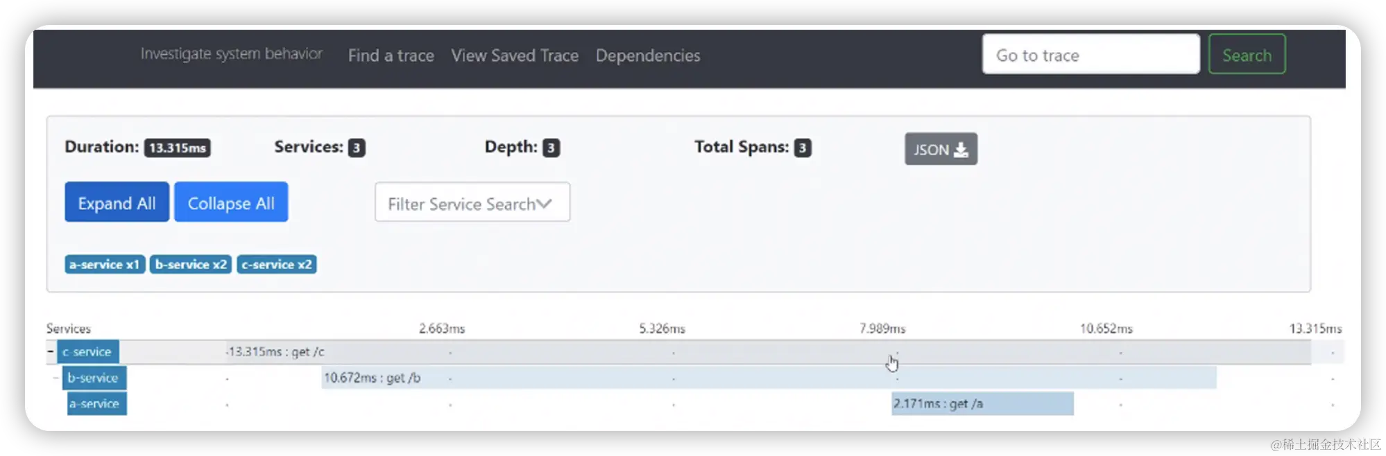 第三,内建链路跟踪体系,在分布式应用中,要梳理服务间的调用关系,实际上是一件很繁琐的事情。但在微服务架构体系下,这个问题就很好解决。因为微服务标准中提供了链路跟踪的技术实现。比如有A、B、C三个服务,ABC三个服务间的调用顺序和调用时长一目了然。通过可视化实现,就可以很直观的了解到各服务间的通信过程及通信状态: