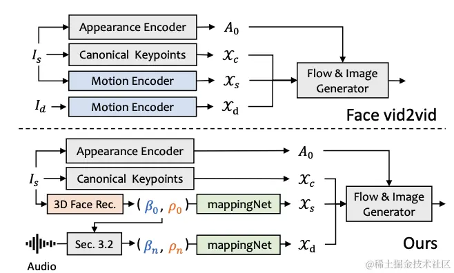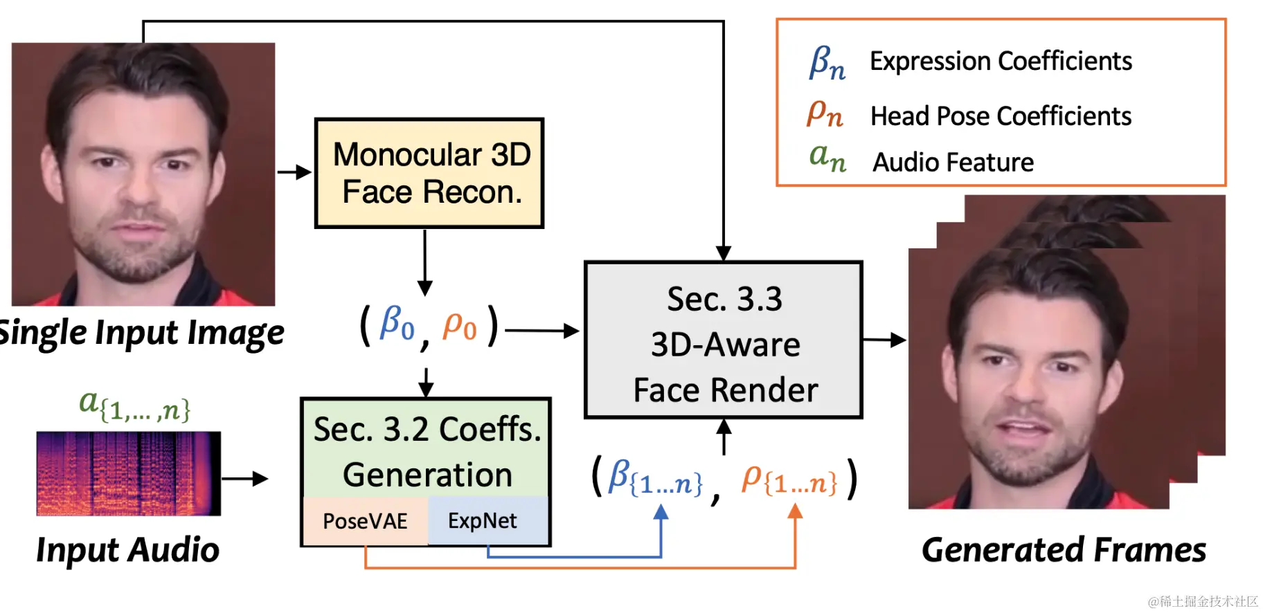 换句话说,我们从输入的音频中独立学习头部姿势ρ=[r, t]和表情系数β,然后使用这些运动系数来隐式调制面部渲染,用于最终的视频合成。这个方法保证了生成的视频在维持头部姿势的差异性的同时,实现了身份无关的系数生成,为最终合成的视频提供了更加自然和逼真的效果。